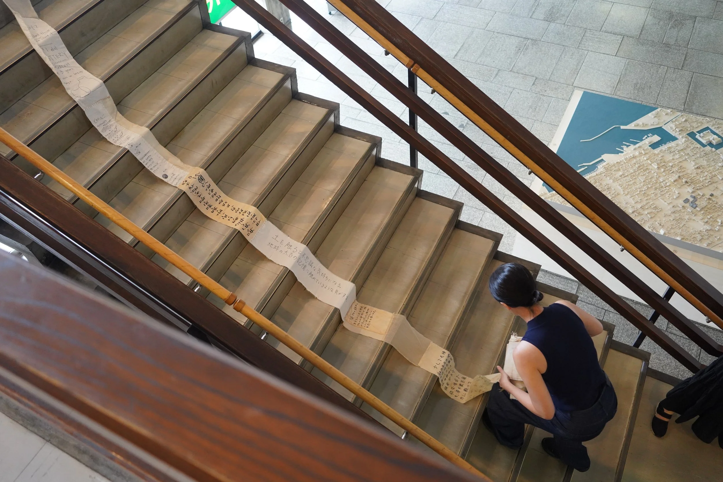 The fabric scroll extends through the architecture of Kenzo Tange, unfolding gently within the space; perhaps one day, it will continue its path, reaching all the way to the port of Matsuyama.